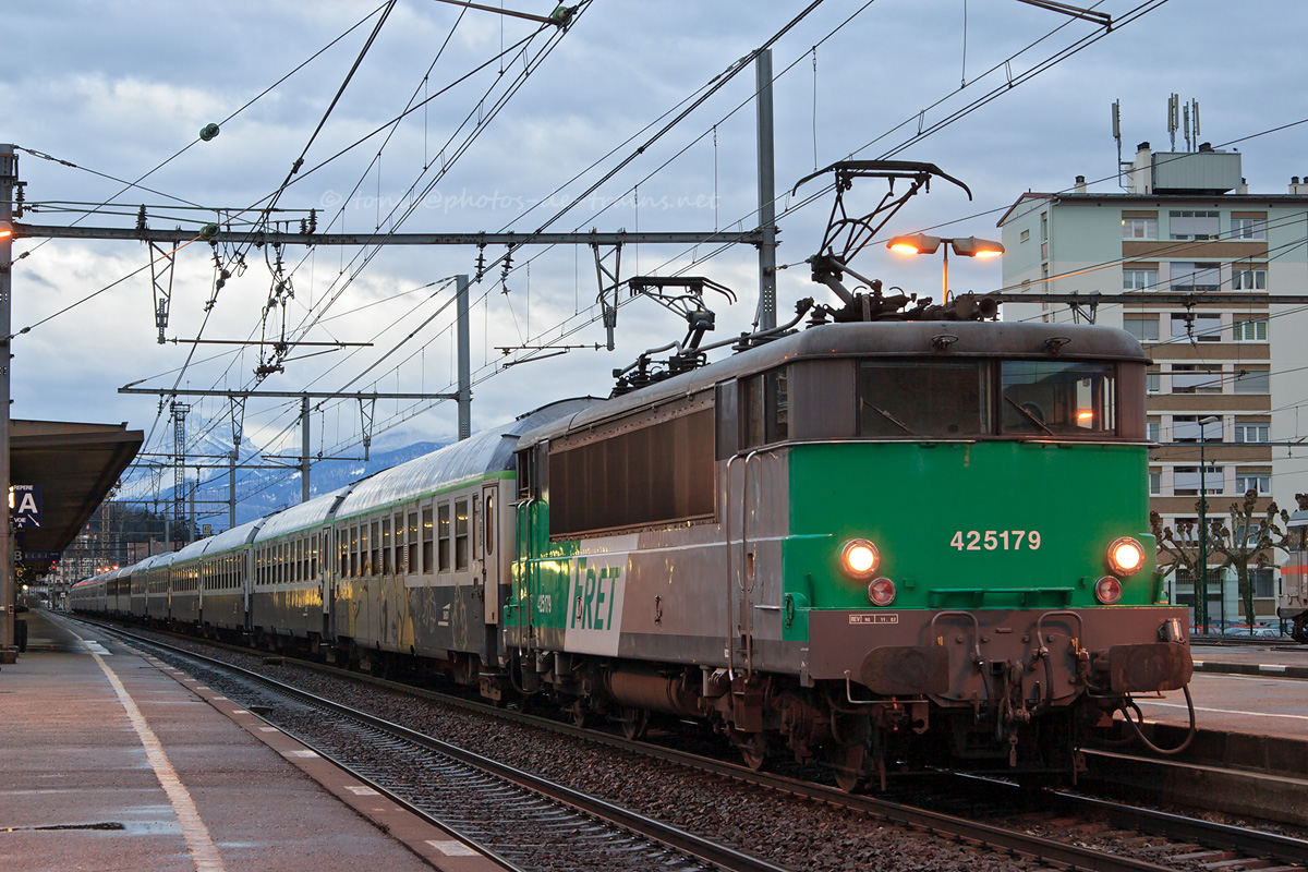 Détails photographie Titre : BB 25179 sur le 4783 Brest - Saint-Gervais Description : Arrivant de Brest, le train de nuit 4878 Brest - Saint-Gervais-les-Bains-le-Fayet entre en gare d'Aix-les-Bains-le-Revard, BB 22364 en tête, et s'apprête à rebrousser en direction d'Annecy. La BB 25179 est ainsi accrochée en tête du train, et la BB 22364 est décrochée. Date de la prise de vue : samedi 04 mars 2006 - 07h43 (heure locale) Date de mise en ligne : samedi 05 mai 2007 - 15h40 Numéro de la photo : 122 Dimensions de la photo : 1200x800 Taille du fichier : 462.55 Ko Cette photo appartient aux thèmes suivants : Pointes d'hiver savoyardes 2005-2006 Cette photo appartient aux types de photo suivants : Trains en gare Cette photo présente les éléments visuels suivants : Conditions météo - Ciel très nuageux Conditions météo - Jour Éléments ferroviaires - Caténaire 1.5 kV |