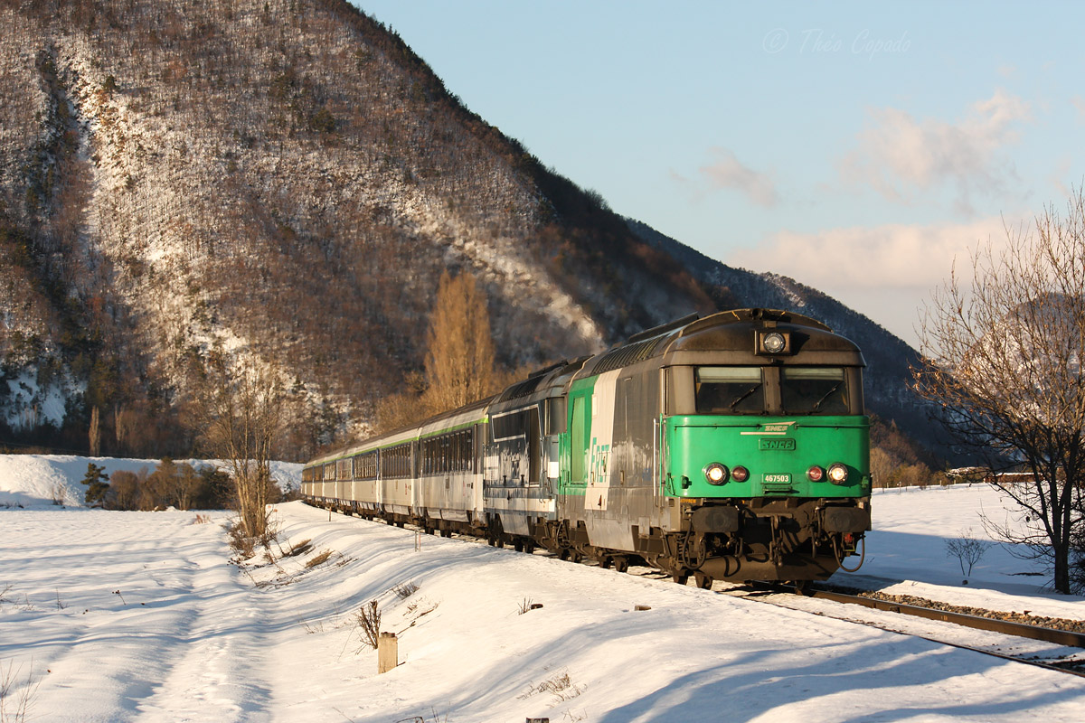Détails photographie Titre : Train de nuit 15893 à La Roche-des-Arnauds Description : Le train de nuit supplémentaire 15893 Paris - Briançon arrive au niveau du village de La Roche-des-Arnauds. Date de la prise de vue : samedi 20 février 2010 - 08h33 (heure locale) Date de mise en ligne : samedi 14 août 2010 - 12h44 Numéro de la photo : 3395 Dimensions de la photo : 1200x800 Taille du fichier : 363.54 Ko Cette photo appartient aux thèmes suivants : Pointes d'hiver briançonnaises 2009-2010 Cette photo appartient aux types de photo suivants : Trains en ligne Cette photo présente les éléments visuels suivants : Conditions météo - Crépuscule/Aube Conditions météo - Jour Conditions météo - Neige Paysage - Montagne/Colline/Falaise |
