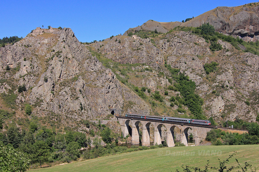 Titre : Le Cévenol sur le célèbre viaduc du Thord Description : Bien à l'heure, le "Cévenol" N°15957 reliant Clermont-Ferrand à Alès franchit le viaduc du Thord, spécialement taillé pour ses trois voitures. Date de la prise de vue : samedi 07 août 2010 - 15h12 (heure locale) Date de mise en ligne : mardi 01 février 2011 - 21h30 Numéro de la photo : 3688 Dimensions de la photo : 900x600 Taille du fichier : 344.12 Ko Cette photo appartient aux types de photo suivants : Trains en ligne Cette photo présente les éléments visuels suivants : Conditions météo - Jour Éléments ferroviaires - Tunnel Paysage - Cours d'eau/Canal Paysage - Montagne/Colline/Falaise Paysage - Pont/Viaduc Notes du photographe : Merci à Fabrice O. pour le transport. |