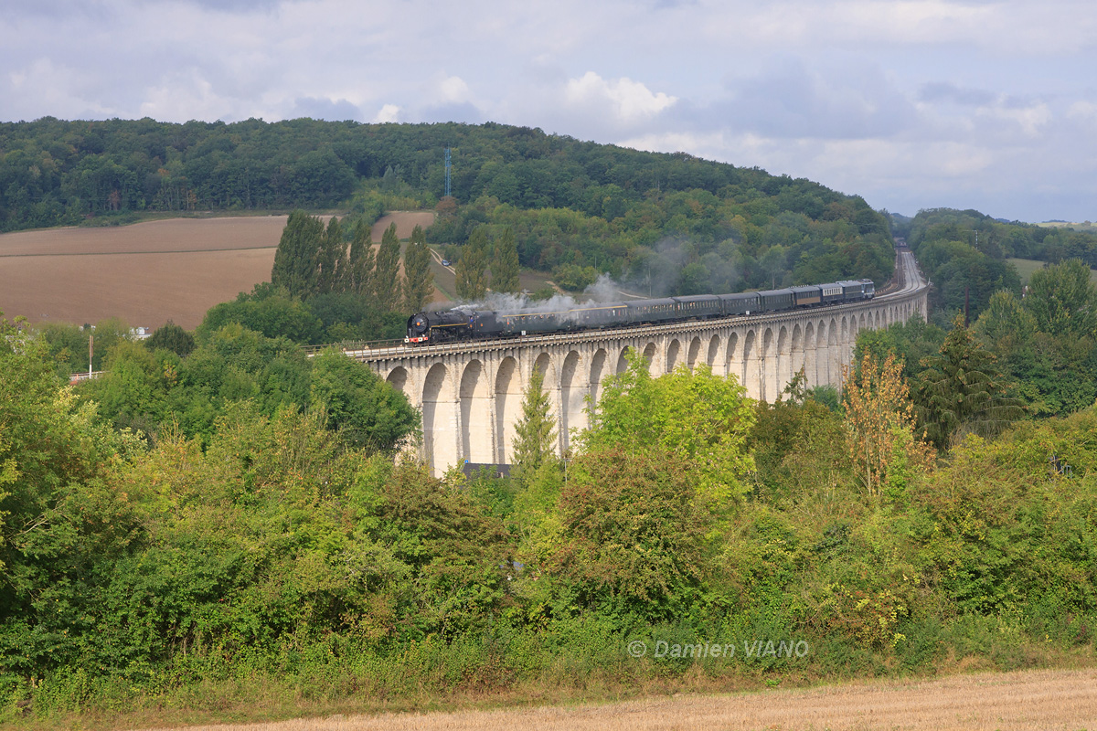 Détails photographie Titre : Train spécial pour Longueville ! Description : Vue du train spécial en provenance de Paris-Est, photographié à quelques centaines de mètres de sa destination finale, sur le célèbre viaduc de Longueville. A noter qu'un relais-traction a eu lieu en gare de Verneuil-l'Etang, où la 141 R 840 a pris la place de l'A1A A1A 68506, placé alors en queue de la rame. Date de la prise de vue : samedi 17 septembre 2011 - 10h17 (heure locale) Date de mise en ligne : jeudi 08 décembre 2011 - 10h54 Numéro de la photo : 4209 Dimensions de la photo : 1200x800 Taille du fichier : 606.84 Ko Cette photo appartient aux thèmes suivants : La rotonde de Longueville fête ses 100 ans ! Cette photo appartient aux types de photo suivants : Trains en ligne Cette photo présente les éléments visuels suivants : Conditions météo - Ciel très nuageux Conditions météo - Jour Éléments ferroviaires - Matériel plaqué (en relief) Paysage - Montagne/Colline/Falaise Paysage - Pont/Viaduc Notes du photographe : Composition du train : DEV AO A8 DEV AO A8 OCEM B10 face lisse, origine État (B10 myfi 34915) Bacalan B11 (ex-C11) (B11 myfi 54763) USI B10 (B10 myfi 83047) USI B10 OCEM PLM (B9c9 yfi 5805) Pullman 1ère classe (4155) Voiture restaurant CIWL (4207) Cette photo a été prise dans le cadre des festivités organisées à l'occasion du centenaire de la rotonde de Longueville, lors des journées du Patrimoine qui se sont déroulées les 17 et 18 septembre 2011. Ce rassemblement de locomotives à vapeur en chauffe est le plus important que l'on ait pu voir en France, depuis la fin de la vapeur au début des années 1970. Plusieurs locomotives sont venues de toute la France (Toulouse, Clermont-Ferrand, Limoges, Orléans...) pour participer aux festivités, et organiser des trains spéciaux sur la célèbre Ligne 4, ainsi que sur l'antenne de Provins. Un grand merci à l'AJECTA pour cette organisation considérable, ainsi qu'à toutes les autres associations présentes, et aux différents service de la SNCF qui ont permis la réalisation de ces circulations ! (ainsi qu'à Romain D. pour l'identification des voitures). |
