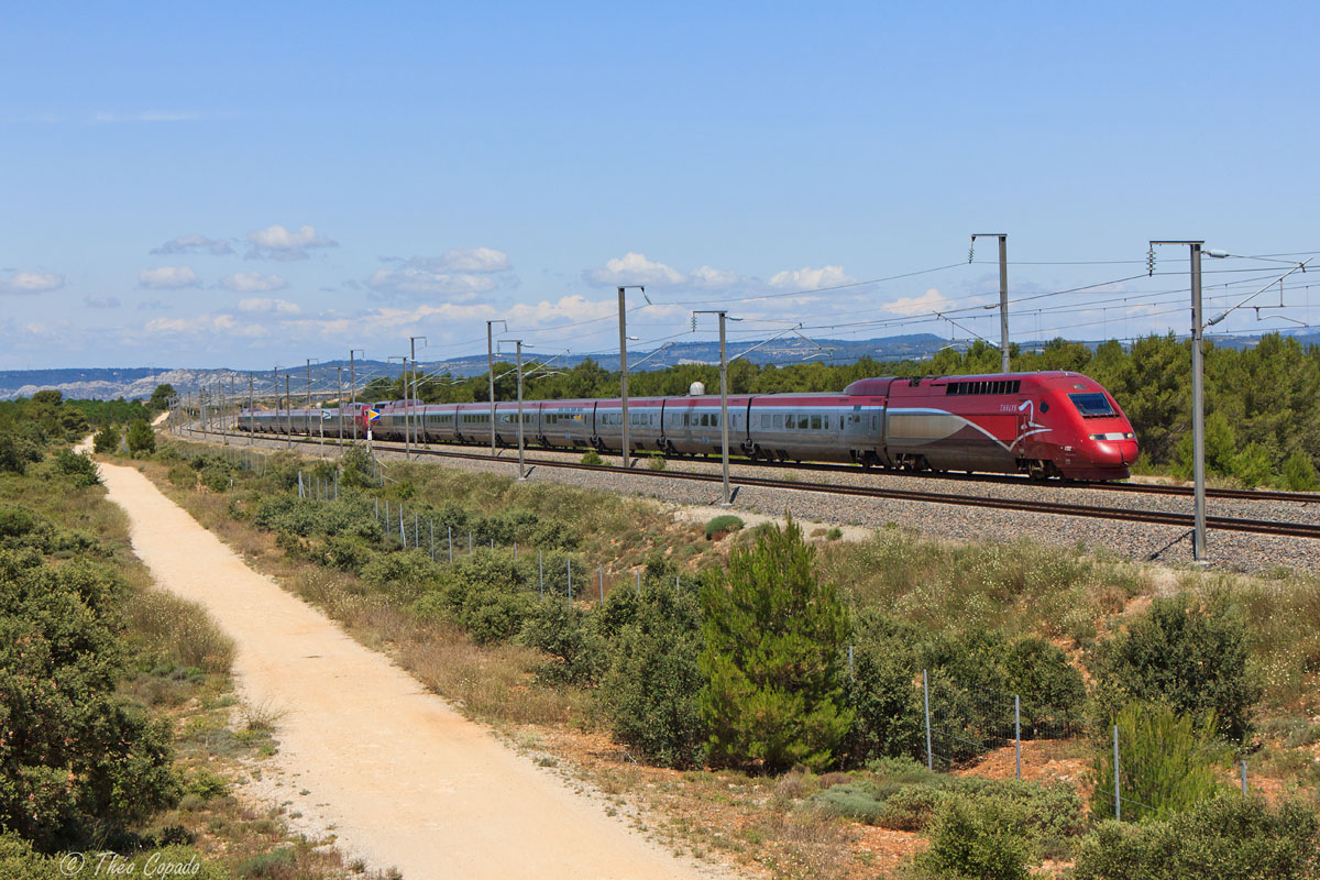Détails photographie Titre : Un Thalys pour le sud ! Description : Peu avant Aix-en-Provence-TGV, le Thalys estival reliant Amsterdam à Marseille passe non loin de Ventabren au Jas-de-Coussou. Date de la prise de vue : samedi 23 juillet 2011 - 12h49 (heure locale) Date de mise en ligne : vendredi 27 janvier 2012 - 11h13 Numéro de la photo : 4309 Dimensions de la photo : 1200x800 Taille du fichier : 297.21 Ko Cette photo appartient aux types de photo suivants : Trains en ligne Cette photo présente les éléments visuels suivants : Conditions météo - Jour Éléments ferroviaires - Caténaire 25 kV Éléments ferroviaires - Signalisation LGV Paysage - Montagne/Colline/Falaise |
