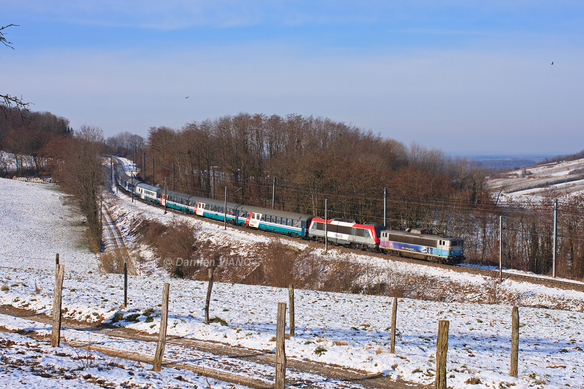 Détails photographie Titre : Secours du Thello dans le Haut-Jura ! Description : Suite à une panne survenue sur le disjoncteur de la BB 36015, titulaire de ce train de nuit privé Venise - Paris, et après une attente de plus de 3 heures sur les évitements de Pont-d'Héry et Mesnay-Arbois, c'est la BB 25639 de la SNCF qui a évacué la rame jusqu'à la gare de Dole. De là , les voyageurs ont été replacés dans un TGV, et la rame remisée au triage. Ce convoi peu banal est vu ici sur la commune d'Aiglepierre, peu avant Mouchard. Date de la prise de vue : dimanche 05 février 2012 - 11h20 (heure locale) Date de mise en ligne : dimanche 26 février 2012 - 10h31 Numéro de la photo : 4390 Dimensions de la photo : 1200x800 Taille du fichier : 613.38 Ko Cette photo appartient aux types de photo suivants : Trains en ligne Cette photo présente les éléments visuels suivants : Conditions météo - Jour Conditions météo - Neige Éléments ferroviaires - Caténaire 25 kV Notes du photographe : Un grand merci à Jean-Louis Poggi pour le transport, et à Baptiste Grandclément pour le coin ! |