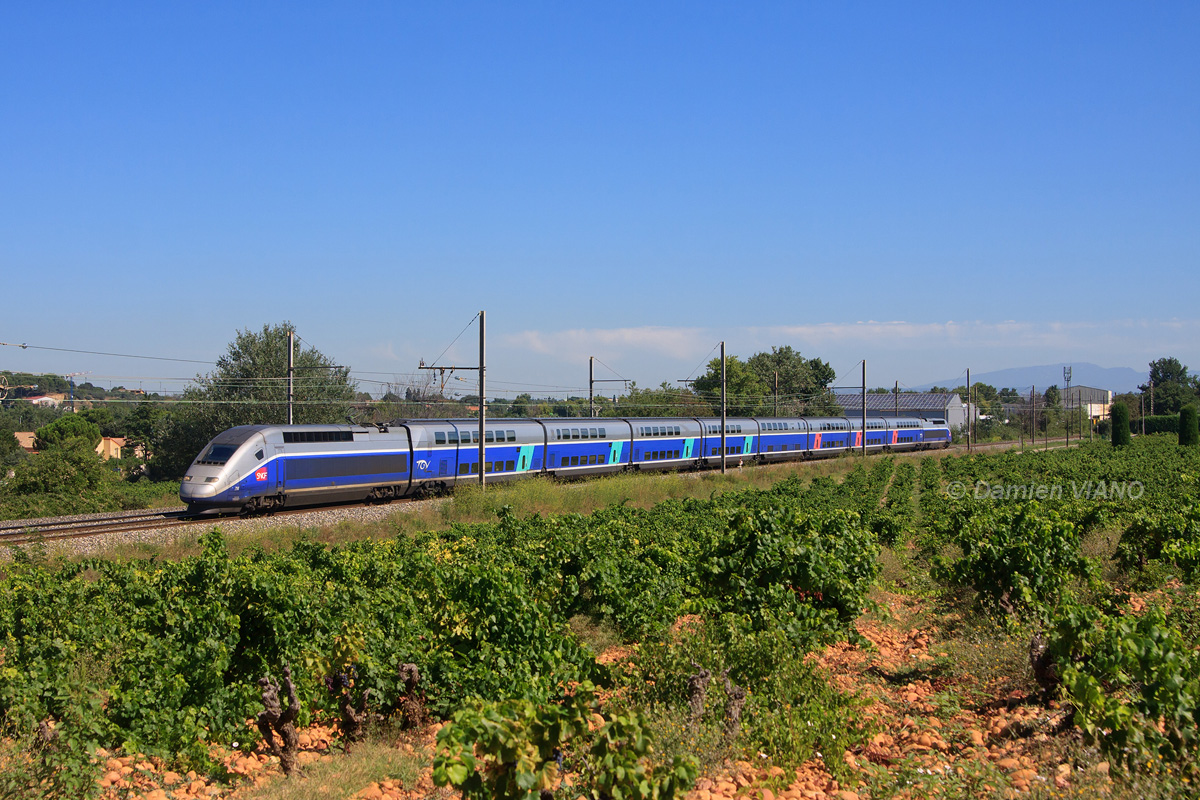 Détails photographie Titre : TGV Paris - Avignon sur ligne classique Description : Sorti de la LGV Méditerranée à Valence pour desservir plusieurs villes de la Vallée du Rhône, ce TGV Dasye à destination de la Cité des Papes est vu dans les vignes, au sud de Bédarrides. Date de la prise de vue : jeudi 11 août 2011 - 11h12 (heure locale) Date de mise en ligne : vendredi 13 avril 2012 - 10h56 Numéro de la photo : 4502 Dimensions de la photo : 1200x800 Taille du fichier : 526.33 Ko Cette photo appartient aux types de photo suivants : Trains en ligne Cette photo présente les éléments visuels suivants : Conditions météo - Jour Éléments ferroviaires - Caténaire 1.5 kV Paysage - Vignes Paysage - Village/Maisons Notes du photographe : Ce TGV est acheminé de Paris-Gare-de-Lyon (07h50) à Lyon-St-Exupéry-TGV (09h43) par le TGV 6905 Paris-Gare-de-Lyon (07h50) - Grenoble (10h56). Merci à Marcel R. pour le transport. |