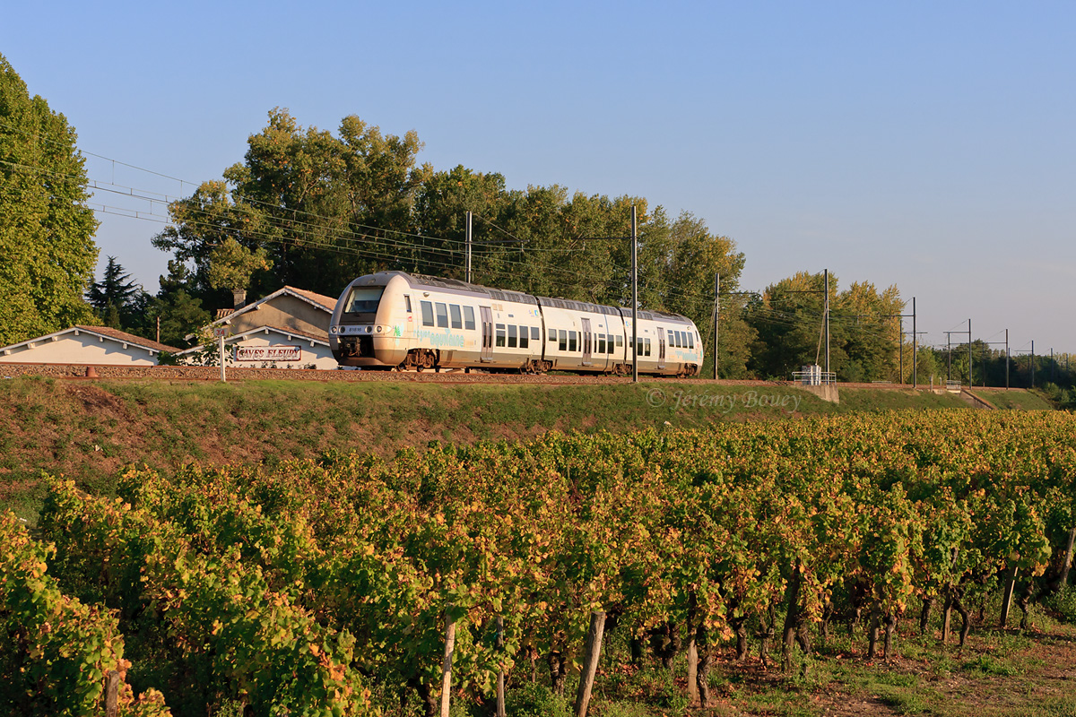 Détails photographie Titre : Retour de Langon pour ce BGC Aquitain Blanc ! Description : Le deuxième BGC Aquitain à avoir reçu ce nouveau pelliculage blanc, le B 81815/16, est vu sur un W Langon - Bordeaux, longeant les vignobles du Sauternais... Date de la prise de vue : vendredi 30 septembre 2011 - 18h18 (heure locale) Date de mise en ligne : lundi 18 juin 2012 - 12h16 Numéro de la photo : 4677 Dimensions de la photo : 1200x800 Taille du fichier : 692.19 Ko Cette photo appartient aux types de photo suivants : Trains en ligne Cette photo présente les éléments visuels suivants : Conditions météo - Jour Éléments ferroviaires - Caténaire 1.5 kV Éléments ferroviaires - Pancarte kilométrique/hectométrique/PN Paysage - Vignes Paysage - Village/Maisons |