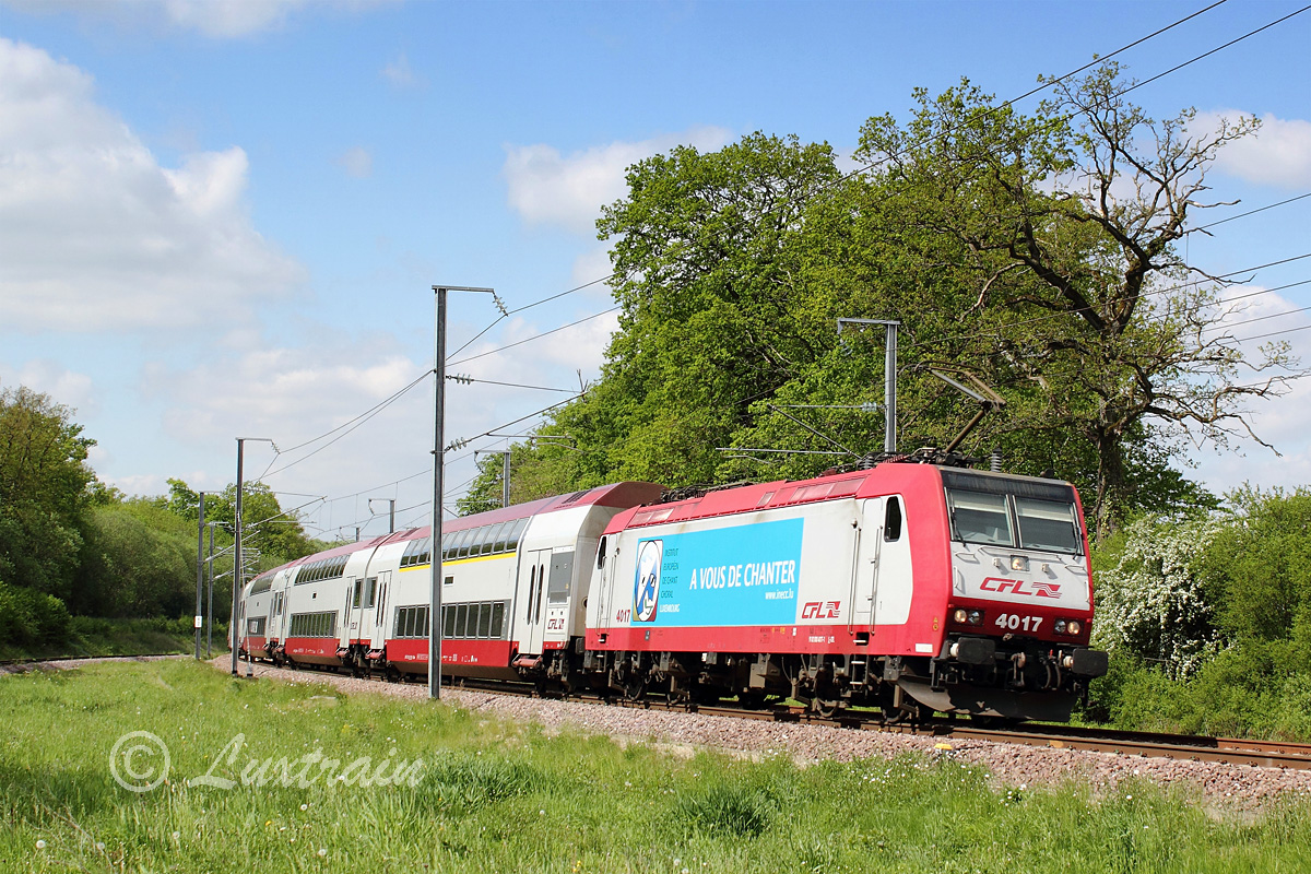 Détails photographie Titre : "À vous de chanter" sur un Rodange - Luxembourg Description : Loco CFL 4017 en livrée "À vous de chanter" assure un train RB entre Rodange et Luxembourg. La ligne empruntée est mise à double voie depuis 2006. Date de la prise de vue : lundi 14 mai 2012 - 11h15 (heure locale) Date de mise en ligne : mardi 31 juillet 2012 - 14h33 Numéro de la photo : 4785 Dimensions de la photo : 1200x800 Taille du fichier : 599.55 Ko Cette photo appartient aux types de photo suivants : Trains en ligne Cette photo présente les éléments visuels suivants : Conditions météo - Ciel très nuageux Conditions météo - Jour Éléments ferroviaires - Pancarte kilométrique/hectométrique/PN |