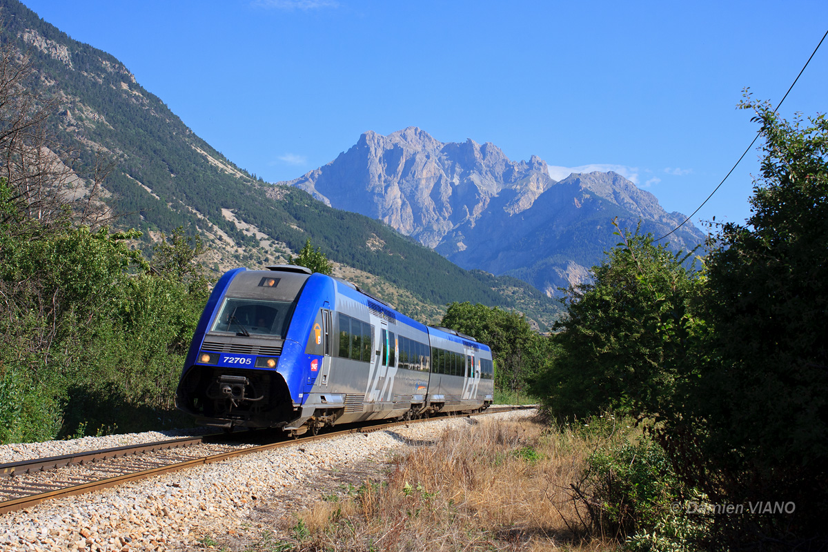 Détails photographie Titre : TER Briançon - Crest Description : Le TER 17358 Briançon - Valence est ce jour-là limité à Crest. Assuré par l'X 72705/6 en solo, il est photographié au sud de L'Argentière, avec la Tête d'Aval et ses 2698 m d'altitude comme toile de fond. Date de la prise de vue : vendredi 20 juillet 2012 - 09h29 (heure locale) Date de mise en ligne : lundi 27 août 2012 - 19h07 Numéro de la photo : 4845 Dimensions de la photo : 1200x800 Taille du fichier : 604.04 Ko Cette photo appartient aux types de photo suivants : Trains en ligne Cette photo présente les éléments visuels suivants : Conditions météo - Jour Paysage - Montagne/Colline/Falaise |