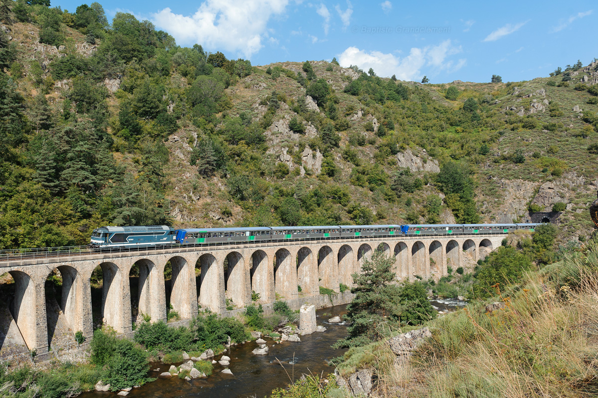 Détails photographie Titre : Pielstick bleu dans les Gorges de l'Allier Description : Composé des RRR 24 et 26 et tracté par la BB 67601, le train touristique faisant découvrir les superbes Gorges de l'Allier redémarre de Chapeauroux et passe ici sur le viaduc de Condres. Date de la prise de vue : mercredi 22 août 2012 - 11h00 (heure locale) Date de mise en ligne : lundi 24 septembre 2012 - 14h26 Numéro de la photo : 4868 Dimensions de la photo : 1200x799 Taille du fichier : 686.96 Ko Cette photo appartient aux types de photo suivants : Trains en ligne Cette photo présente les éléments visuels suivants : Conditions météo - Jour Éléments ferroviaires - Tunnel Paysage - Cours d'eau/Canal Paysage - Montagne/Colline/Falaise Paysage - Pont/Viaduc |