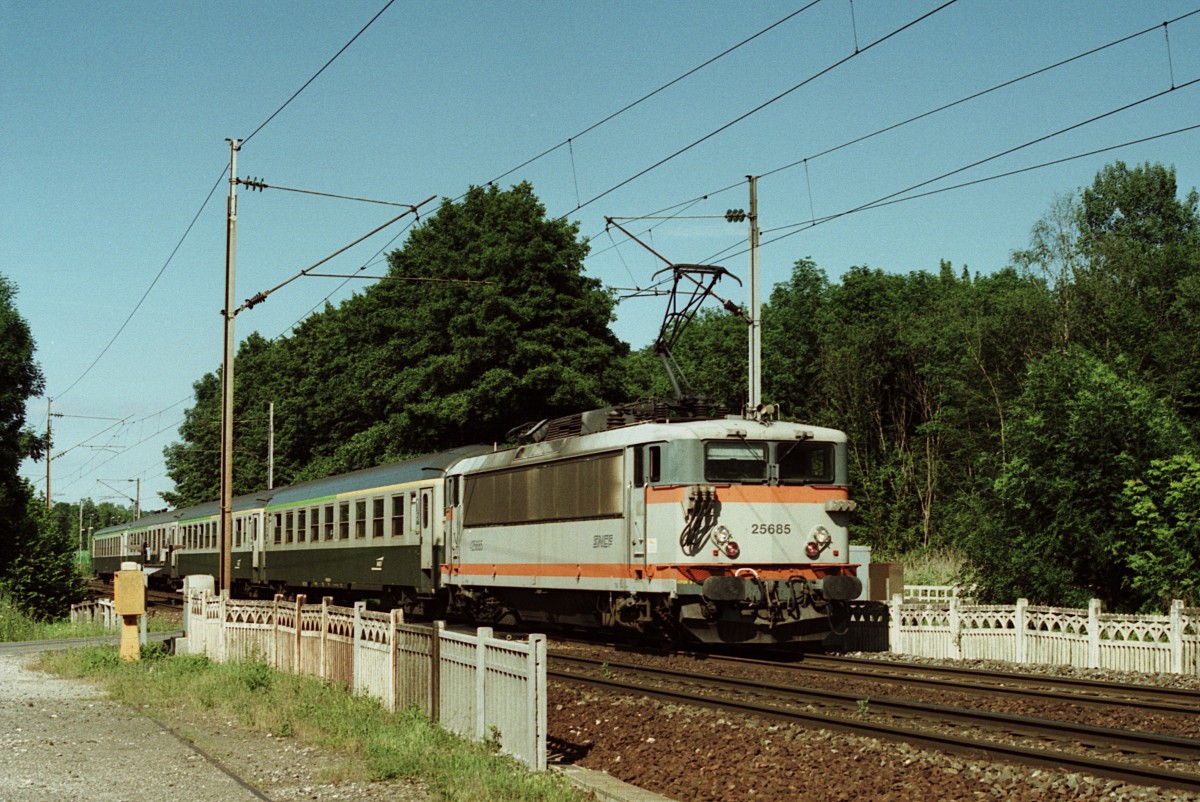 Détails photographie Titre : TER en vert et gris Description : Au PN 111 de la ligne 28, près du PK 499, le TER 894042 Belfort - Besançon Viotte, composé de 4 voitures, en livrée verte et grise (2 A4B5 UIC + 1 B5D UIC + 1 B4t5 1/2 USI), est tracté par la BB 25685. Date de la prise de vue : dimanche 03 juillet 2005 - 17h40 (heure locale) Date de mise en ligne : jeudi 08 novembre 2012 - 14h27 Numéro de la photo : 4969 Dimensions de la photo : 1200x802 Taille du fichier : 310.07 Ko Cette photo appartient aux types de photo suivants : Trains en ligne Cette photo présente les éléments visuels suivants : Conditions météo - Jour Éléments ferroviaires - Caténaire 25 kV Éléments ferroviaires - Passage à niveau |