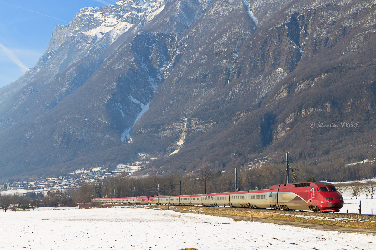 Détails photographie Titre : Thalys des neiges ! Description : Assuré par cette UM mixte PBA/PBKA, les Thalys 9920/9921 et 9924/9925 Amsterdam - Bruxelles - Bourg-St-Maurice sont mis en place à l'occasion des week-ends de pointes en Savoie. Ils s'apprêtent à traverser la gare de Grésy-sur-Isère. Date de la prise de vue : samedi 18 février 2012 - 13h31 (heure locale) Date de mise en ligne : lundi 18 février 2013 - 11h16 Numéro de la photo : 5182 Dimensions de la photo : 1200x800 Taille du fichier : 373.08 Ko Cette photo appartient aux thèmes suivants : Pointes d'hiver savoyardes 2011-2012 Cette photo appartient aux types de photo suivants : Trains en ligne Cette photo présente les éléments visuels suivants : Conditions météo - Jour Conditions météo - Neige Éléments ferroviaires - Caténaire 1.5 kV Paysage - Montagne/Colline/Falaise Paysage - Village/Maisons |