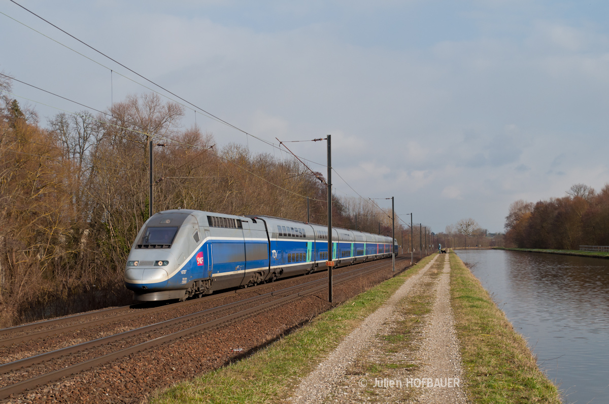 Détails photographie Titre : Euroduplex à Steinbourg Description : Par une après-midi ensoleillée, la rame Euroduplex 4707, en charge du train 9574, en provenance de Stuttgart HBF et à destination de Paris-Est, longe le Canal de la Marne au Rhin. Elle va bientôt traverser la gare de Steinbourg. Date de la prise de vue : samedi 09 février 2013 - 14h36 (heure locale) Date de mise en ligne : lundi 18 mars 2013 - 19h31 Numéro de la photo : 5246 Dimensions de la photo : 1200x797 Taille du fichier : 680.73 Ko Cette photo appartient aux types de photo suivants : Trains en ligne Cette photo présente les éléments visuels suivants : Conditions météo - Ciel très nuageux Conditions météo - Jour Éléments ferroviaires - Caténaire 25 kV Éléments ferroviaires - Pancarte kilométrique/hectométrique/PN Paysage - Cours d'eau/Canal |