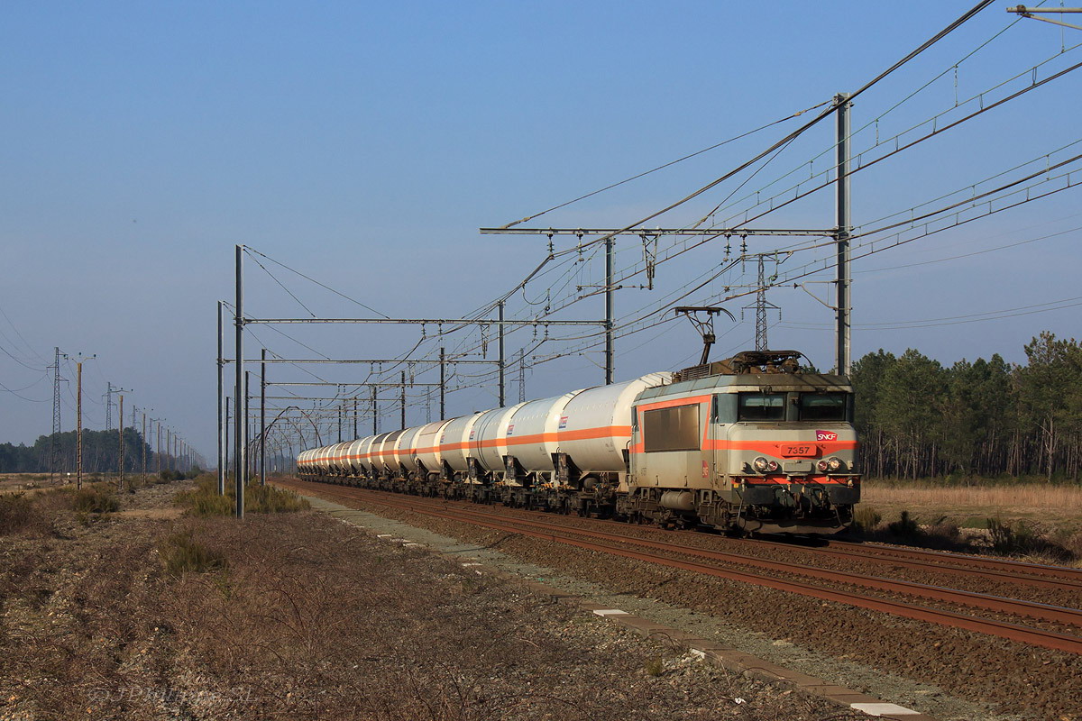 Détails photographie Titre : Citernes et 7200 dans les Landes Description : La BB 7357 est en charge de ce train pour Artix. La présence des supports modernes s'explique part le fait qu'à cet endroit, il y eut une zone d'essais des aiguillages à pointe mobile autorisant des vitesses supérieures à 160 km/h, destinées à équiper les futures LGV. Date de la prise de vue : mercredi 27 février 2013 - 15h58 (heure locale) Date de mise en ligne : jeudi 25 avril 2013 - 11h47 Numéro de la photo : 5345 Dimensions de la photo : 1200x800 Taille du fichier : 322.49 Ko Cette photo appartient aux types de photo suivants : Trains en ligne Cette photo présente les éléments visuels suivants : Conditions météo - Jour Éléments ferroviaires - Caténaire 1.5 kV Éléments ferroviaires - Ogives |