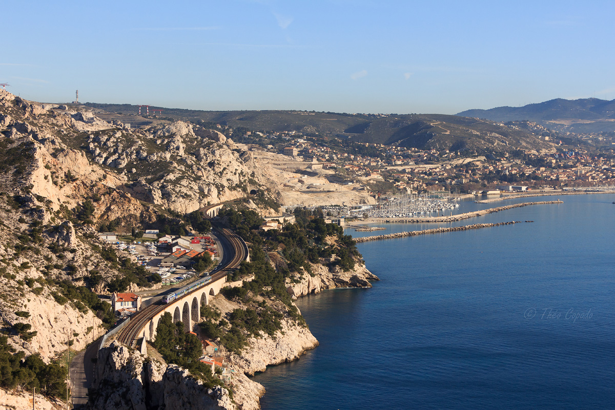 Détails photographie Titre : Panorama de la Côte Bleue Description : Assurant un TER Marseille - Miramas via Martigues, cet ensemble 67400 + RRR est vu sur la Côte Bleue près du Rove sur fond de baie de l'Estaque. Date de la prise de vue : lundi 26 décembre 2011 - 11h07 (heure locale) Date de mise en ligne : dimanche 13 octobre 2013 - 15h17 Numéro de la photo : 5853 Dimensions de la photo : 1200x800 Taille du fichier : 526.63 Ko Cette photo appartient aux types de photo suivants : Trains en ligne Cette photo présente les éléments visuels suivants : Conditions météo - Jour Éléments ferroviaires - Tunnel Paysage - Mer/Lac/Étang Paysage - Montagne/Colline/Falaise Paysage - Navires/Bateaux Paysage - Pont/Viaduc Paysage - Village/Maisons |