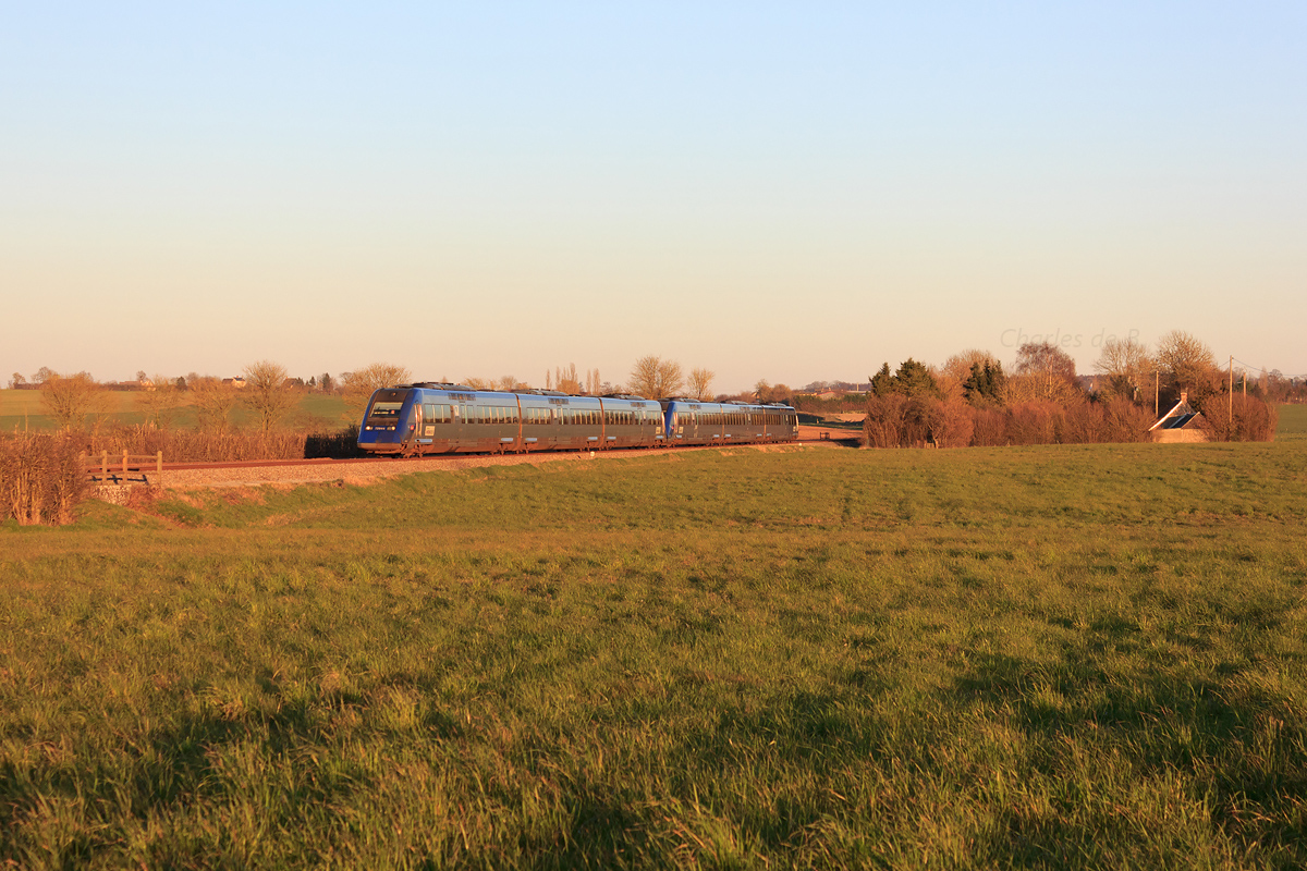 Détails photographie Titre : X 72500 en UM au couchant Description : Derniers rayons de soleil pour les X 72643/44 et X 72671/72 en UM, en charge de l'IC 3443 Paris-Vaugirard - Granville, peu après Le Merlerault. Une image qui appartiendra bientôt au passé avec l'arrivée des Regiolis sur la ligne dans le courant de l'année 2014. Date de la prise de vue : dimanche 09 mars 2014 - 18h27 (heure locale) Date de mise en ligne : vendredi 18 avril 2014 - 16h20 Numéro de la photo : 6235 Dimensions de la photo : 1200x800 Taille du fichier : 605.89 Ko Cette photo appartient aux types de photo suivants : Trains en ligne Cette photo présente les éléments visuels suivants : Conditions météo - Crépuscule/Aube Conditions météo - Jour Paysage - Village/Maisons |