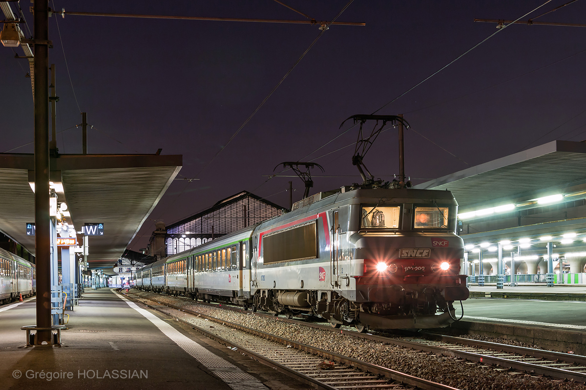 Détails photographie Titre : Départ nocturne de la 7292 Description : Prête au départ pour assurer les Intercités de nuit vers Latour-de-Carol et Port-Bou, la 7292 est vue en tête de sa rame corail à Paris-Austerlitz. Les deux tranches seront coupées à Toulouse. Date de la prise de vue : mercredi 09 avril 2014 - 21h48 (heure locale) Date de mise en ligne : samedi 31 mai 2014 - 16h14 Numéro de la photo : 6340 Dimensions de la photo : 1200x800 Taille du fichier : 548.84 Ko Cette photo appartient aux types de photo suivants : Trains en gare Cette photo présente les éléments visuels suivants : Conditions météo - Nuit Éléments ferroviaires - Caténaire 1.5 kV Éléments ferroviaires - Marquise/Verrière |