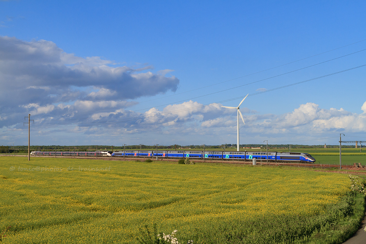 Détails photographie Titre : TGV 5241 et 5454 Description : Les TGV 5241 Lille-Europe - Bordeaux-Saint-Jean et 5454 Strasbourg - Bordeaux-Saint-Jean sont vu ici près d'Auneau, assurés par une UM composée d'un TGV R/D et d'un TGV Réseau. Date de la prise de vue : dimanche 11 mai 2014 - 19h24 (heure locale) Date de mise en ligne : samedi 05 juillet 2014 - 16h48 Numéro de la photo : 6435 Dimensions de la photo : 1200x800 Taille du fichier : 496.05 Ko Cette photo appartient aux types de photo suivants : Trains en ligne Cette photo présente les éléments visuels suivants : Conditions météo - Ciel très nuageux Conditions météo - Jour Éléments ferroviaires - Caténaire 25 kV Paysage - Clocher/Château Paysage - Éoliennes Paysage - Fleurs/Champs fleuris Paysage - Village/Maisons |