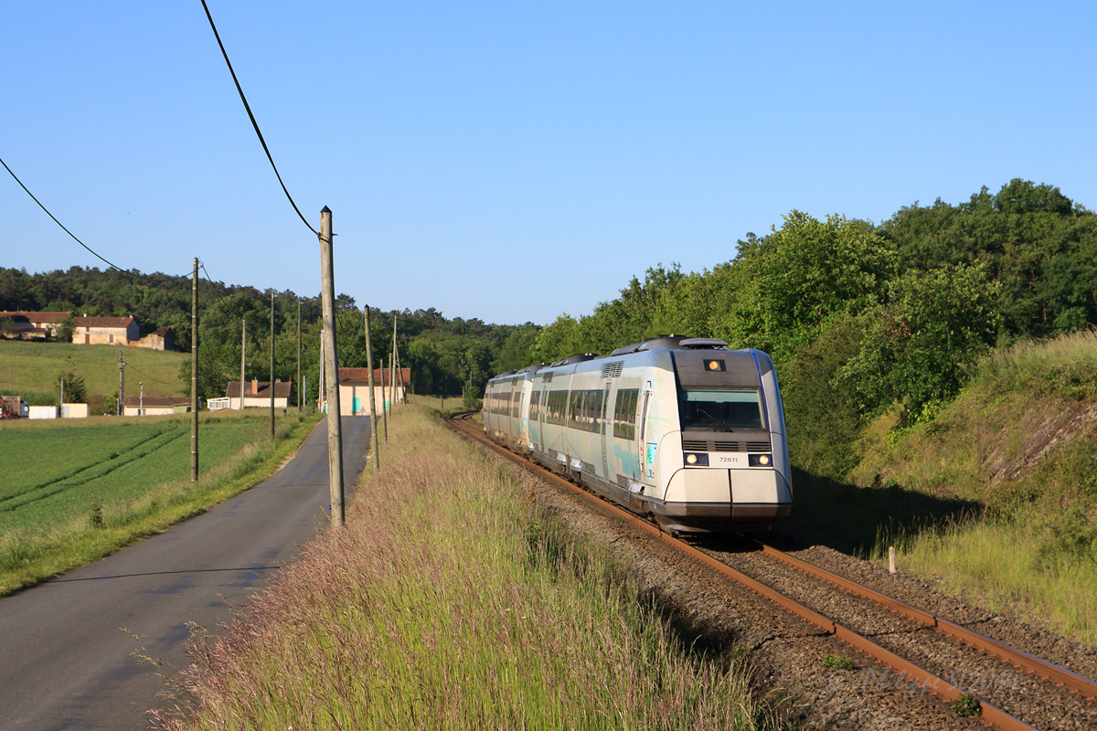 Détails photographie Titre : XTER's Périgueux - Limoges avant Négrondes Description : Cette UM d'X 72500 assurant un TER Périgueux - Limoges va bientôt franchir sans arrêt la gare de Négrondes. Date de la prise de vue : samedi 17 mai 2014 - 08h56 (heure locale) Date de mise en ligne : vendredi 18 juillet 2014 - 21h35 Numéro de la photo : 6490 Dimensions de la photo : 1200x800 Taille du fichier : 353.75 Ko Cette photo appartient aux types de photo suivants : Trains en ligne Cette photo présente les éléments visuels suivants : Conditions météo - Jour Paysage - Village/Maisons |