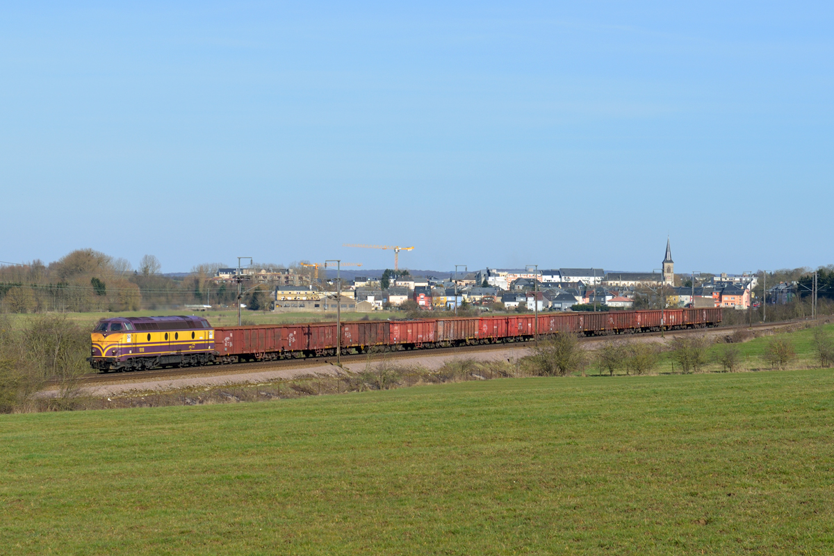 Détails photographie Titre : Les ferrailleurs Description : Le diesel quinquagénaire 1818 tracte une rame complète de ferraille destinée pour l'aciérie d'Arcelor Mittal de Differdange. La charge du train est au maximum autorisé pour ce type d'engin de traction. Les CC 1800, construites en 1964 par La Brugeoise et Nivelles, sont de type diesel-électrique. Leur moteur diesel GM développe une puissance de 1800 CV et leur Vmax est de 120 km/h. Date de la prise de vue : lundi 24 février 2014 - 15h15 (heure locale) Date de mise en ligne : mercredi 23 juillet 2014 - 11h01 Numéro de la photo : 6523 Dimensions de la photo : 1200x800 Taille du fichier : 663.23 Ko Cette photo appartient aux types de photo suivants : Trains en ligne Cette photo présente les éléments visuels suivants : Conditions météo - Jour Éléments ferroviaires - Caténaire 25 kV Paysage - Clocher/Château Paysage - Village/Maisons |