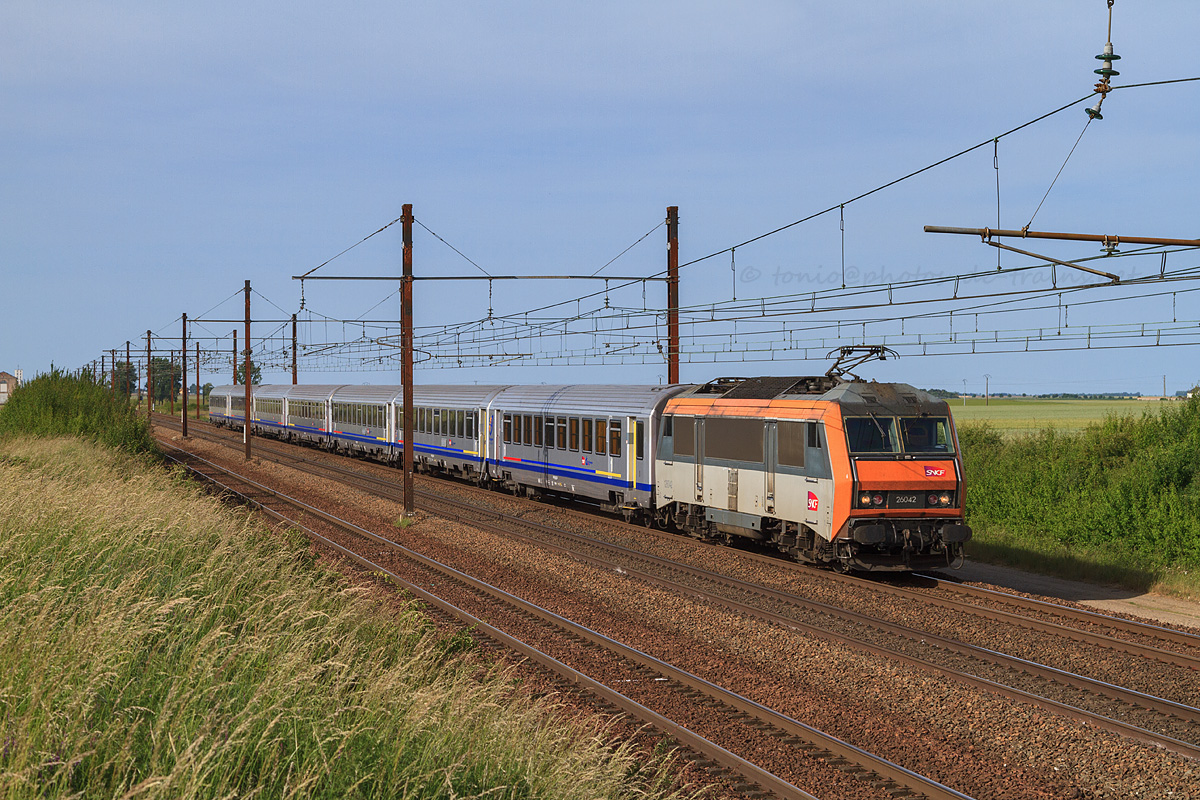 Détails photographie Titre : BB 26042 et rame TER Bourgogne sur le PO Description : Hors de ses terres habituelles, une rame TER Bourgogne effectuer le TER 860513 Paris Austerlitz - Orléans, tracté par la BB 26042. Date de la prise de vue : mardi 24 mai 2011 - 18h26 (heure locale) Date de mise en ligne : mardi 14 octobre 2014 - 17h43 Numéro de la photo : 6711 Dimensions de la photo : 1200x800 Taille du fichier : 549.43 Ko Cette photo appartient aux thèmes suivants : D'une région à une autre ! Cette photo appartient aux types de photo suivants : Trains en ligne Cette photo présente les éléments visuels suivants : Conditions météo - Jour Éléments ferroviaires - Caténaire 1.5 kV |