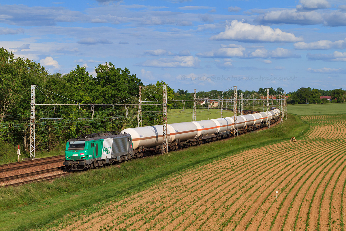 Détails photographie Titre : Train de citernes dans la courbe de Joigny Description : Assurant le 482020 Gevrey - Villeneuve-Saint-Georges, la BB 27038 achemine ses wagons citernes et est vue ici près de Joigny. Date de la prise de vue : lundi 19 mai 2014 - 18h17 (heure locale) Date de mise en ligne : lundi 08 décembre 2014 - 14h18 Numéro de la photo : 6833 Dimensions de la photo : 1200x800 Taille du fichier : 599.21 Ko Cette photo appartient aux types de photo suivants : Trains en ligne Cette photo présente les éléments visuels suivants : Conditions météo - Ciel très nuageux Conditions météo - Jour Éléments ferroviaires - Caténaire 1.5 kV Paysage - Village/Maisons |