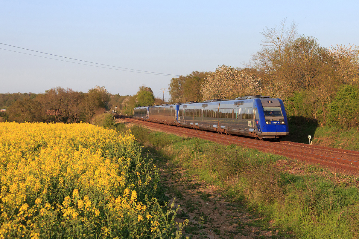 Détails photographie Titre : UM triple de X 72500 pour Argentan Description : La présence des X 72500 sur les relations Paris Vaugirard - Argentan - Granville est à son crépuscule. Néanmoins, les problèmes de fiabilité récurrents de leurs successeurs, les Regiolis B 84500, leur accordent encore plusieurs mois de sursis: les X72647/72648, X 72719/72720 et X 72667/72668 assurent en UM triple le TER 16515 Paris Vaugirard - Argentan. Ils sont surpris avec près de 20 minutes de retard peu avant Verneuil sur Avre. Date de la prise de vue : jeudi 23 avril 2015 - 19h56 (heure locale) Date de mise en ligne : jeudi 07 mai 2015 - 15h40 Numéro de la photo : 6955 Dimensions de la photo : 1200x800 Taille du fichier : 633 Ko Cette photo appartient aux types de photo suivants : Trains en ligne Cette photo présente les éléments visuels suivants : Conditions météo - Jour Éléments ferroviaires - Pancarte kilométrique/hectométrique/PN Paysage - Fleurs/Champs fleuris |