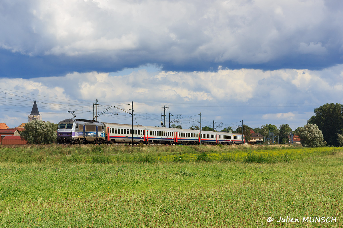 Détails photographie Titre : EC 90 sous ciel chargé Description : BB 26164 en tête de l'EC 90 Basel - Luxembourg traverse la plaine d’Alsace sous un ciel très menaçant. Date de la prise de vue : lundi 11 août 2014 - 15h09 (heure locale) Date de mise en ligne : mercredi 10 juin 2015 - 16h47 Numéro de la photo : 6966 Dimensions de la photo : 1200x800 Taille du fichier : 508.04 Ko Cette photo appartient aux types de photo suivants : Trains en ligne Cette photo présente les éléments visuels suivants : Conditions météo - Ciel très nuageux Conditions météo - Jour Éléments ferroviaires - Caténaire 25 kV Paysage - Clocher/Château |