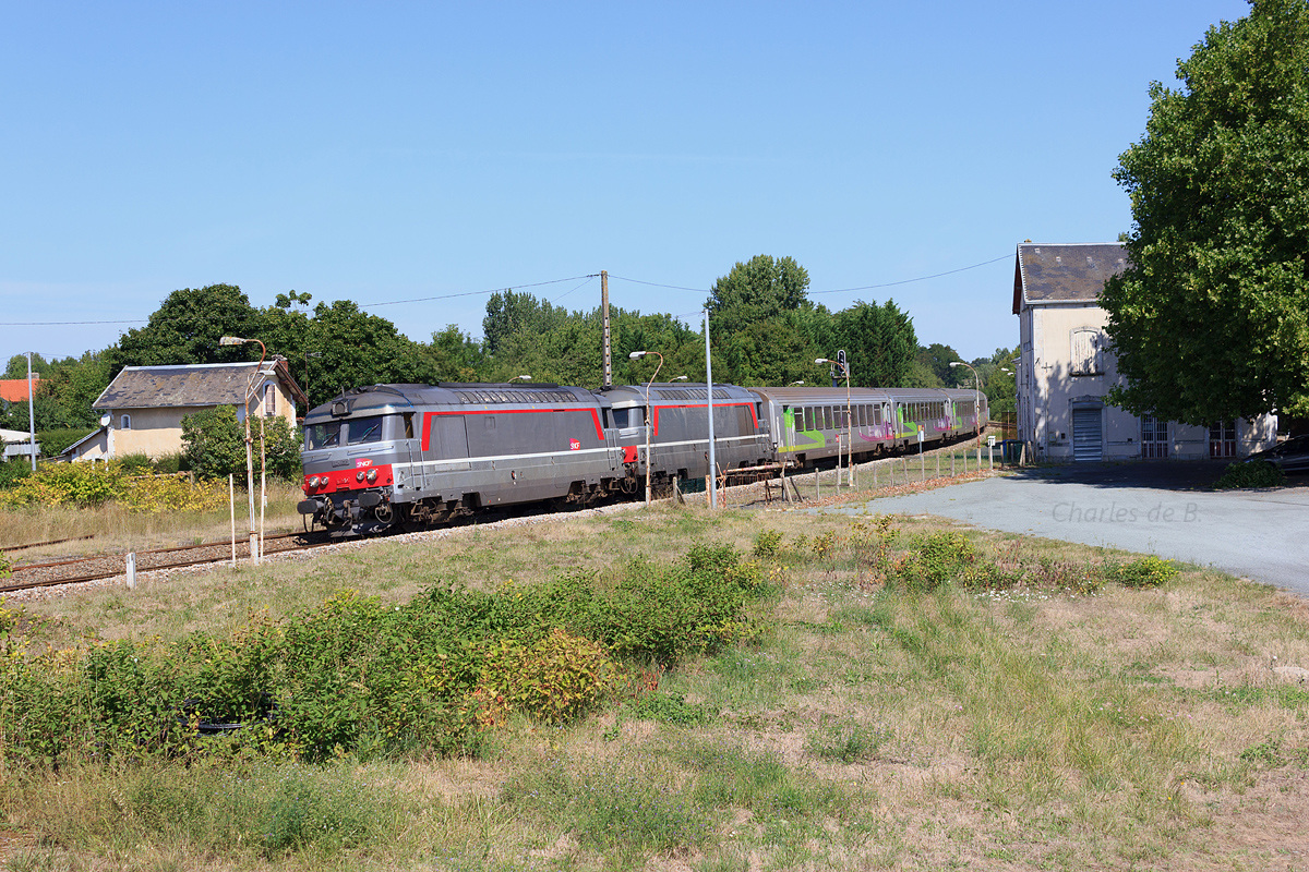 Détails photographie Titre : BB 67554 et BB 67436 sur le Quimper - Bordeaux Description : Passage en trombe en gare de bifurcation de Beillant, avec des installations encore bien "à l'ancienne", des BB 67554 et BB 67436 en UM sur l'IC 3831 Quimper - Bordeaux Saint Jean. Depuis le 13 décembre 2015, ce train est origine Nantes désormais. A noter que les trains de et pour Bordeaux Saint Jean ne s'arrêtent plus depuis bien longtemps à Beillant. Date de la prise de vue : lundi 10 août 2015 - 12h14 (heure locale) Date de mise en ligne : mardi 15 décembre 2015 - 13h08 Numéro de la photo : 7596 Dimensions de la photo : 1200x800 Taille du fichier : 684.16 Ko Cette photo appartient aux types de photo suivants : Trains en gare Cette photo présente les éléments visuels suivants : Conditions météo - Jour Éléments ferroviaires - Signalisation lumineuse Paysage - Village/Maisons Notes du photographe : Gare de Beillant cependant desservie par uniquement 2 trains par jour, un dans chaque sens, sur la ligne Saintes-Angoulême. Sinon, privilégier la gare de Saintes, à 10 km. |