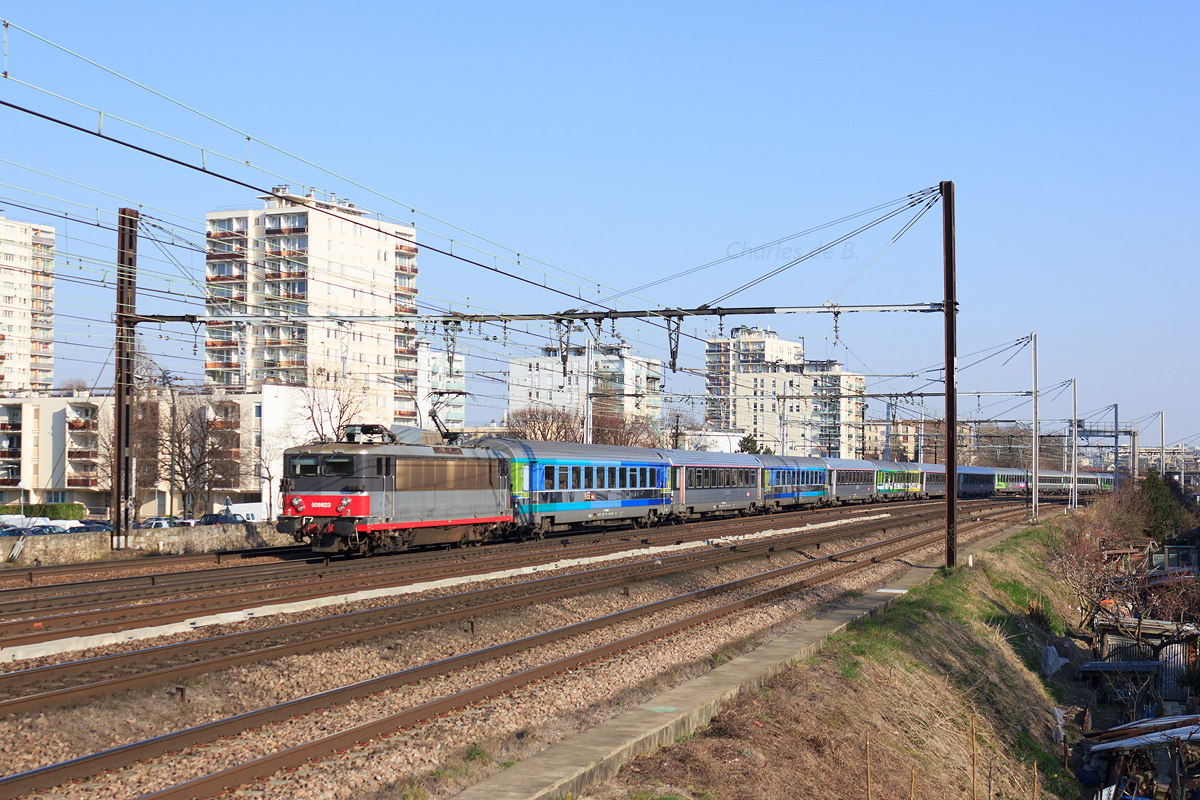 Détails photographie Titre : BB 8623 au Vert-de-Maisons Description : Image désormais du passé : la BB 8623 ramène une rame à la livrée bigarrée depuis Paris-Bercy au faisceau de Villeneuve-Prairie. Depuis, elle a été radiée le 20 janvier 2016. Date de la prise de vue : mardi 02 avril 2013 - 08h43 (heure locale) Date de mise en ligne : mardi 24 mai 2016 - 15h09 Numéro de la photo : 7849 Dimensions de la photo : 1200x800 Taille du fichier : 680.74 Ko Cette photo appartient aux types de photo suivants : Trains en ligne Cette photo présente les éléments visuels suivants : Conditions météo - Jour Éléments ferroviaires - Caténaire 1.5 kV |
