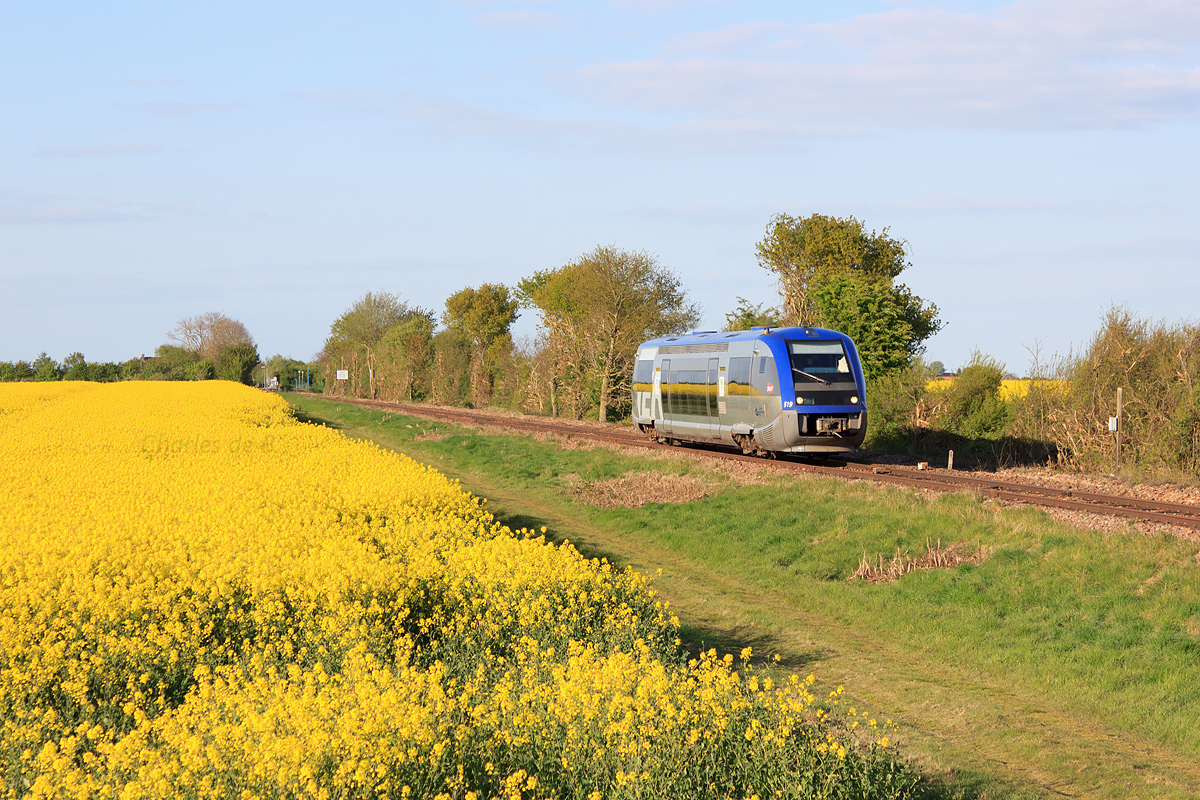 Détails photographie Titre : X 73519 pour Courtalain Description : Le X 73519 assure en solo le TER 862219 Chartres - Courtalain-Saint-Pellerin et passe en fin de journée, alors que le colza est en fleur. À noter qu'il s'agit d'un engin ex-TER Alsace, muté à Tours pour le TER Centre. Date de la prise de vue : dimanche 23 avril 2017 - 19h02 (heure locale) Date de mise en ligne : vendredi 05 mai 2017 - 14h44 Numéro de la photo : 8945 Dimensions de la photo : 1200x800 Taille du fichier : 792.02 Ko Cette photo appartient aux types de photo suivants : Trains en ligne Cette photo présente les éléments visuels suivants : Conditions météo - Jour Éléments ferroviaires - Pancarte kilométrique/hectométrique/PN Éléments ferroviaires - Pancarte/Tableau Paysage - Fleurs/Champs fleuris |